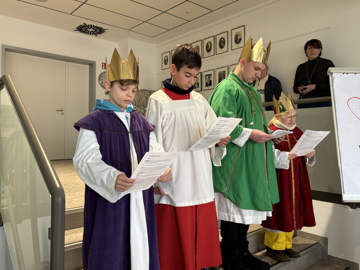 Nach dem traditionellen Sternsingerlied führten einige Kinder noch ein kurzes Rollenspiel auf, um auf den diesjährigen Fokus der Aktion aufmerksam zu machen. Das Thema lautet „Schule statt Fabrik“ und richtet sich gegen Kinderarbeit. Die Erlöse aus der Spendenaktion werden schwerpunktmäßig an Organisationen aus diesem Bereich übergeben.