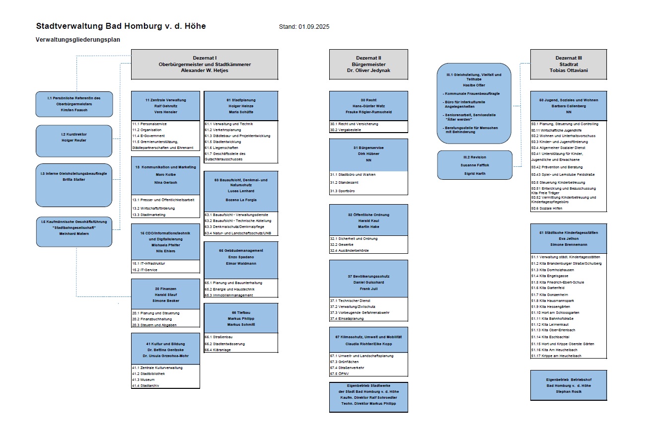 Übersicht der Dezernate, der zugehörigen Dezernenten, Fachbereiche, Fachdienste und Produktbereiche.